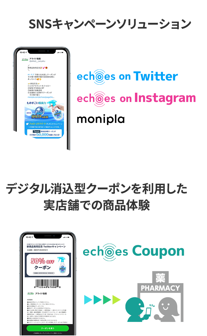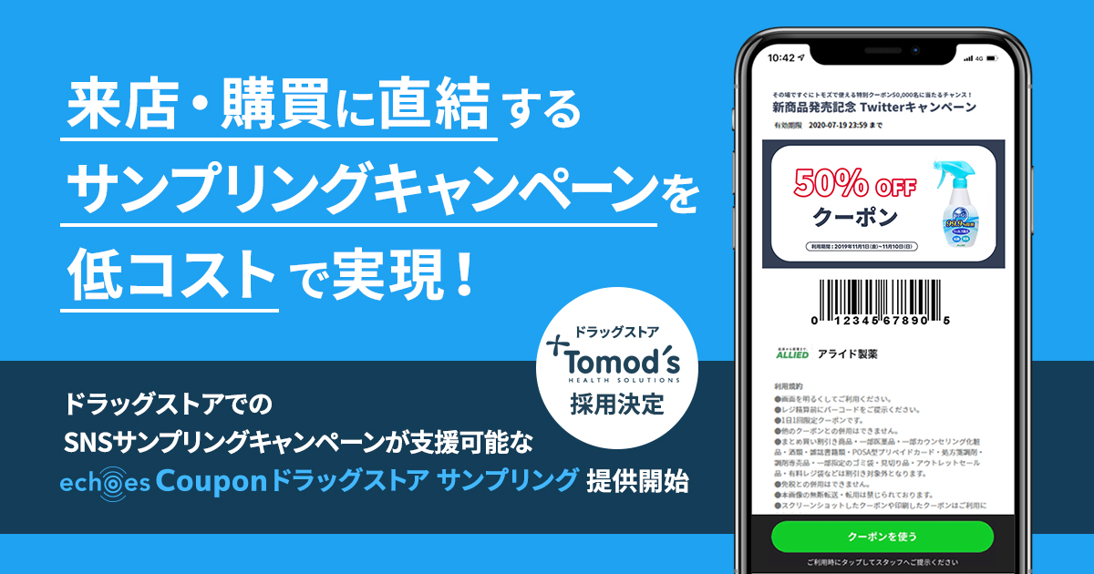 【来店/購買に直結するサンプリングキャンペーンを低コストで実現!】 ドラッグストアでのSNSサンプリングキャンペーンが支援可能な「echoes Couponドラッグストアサンプリング」を提供開始。ドラッグストア「トモズ」が本システムを採用