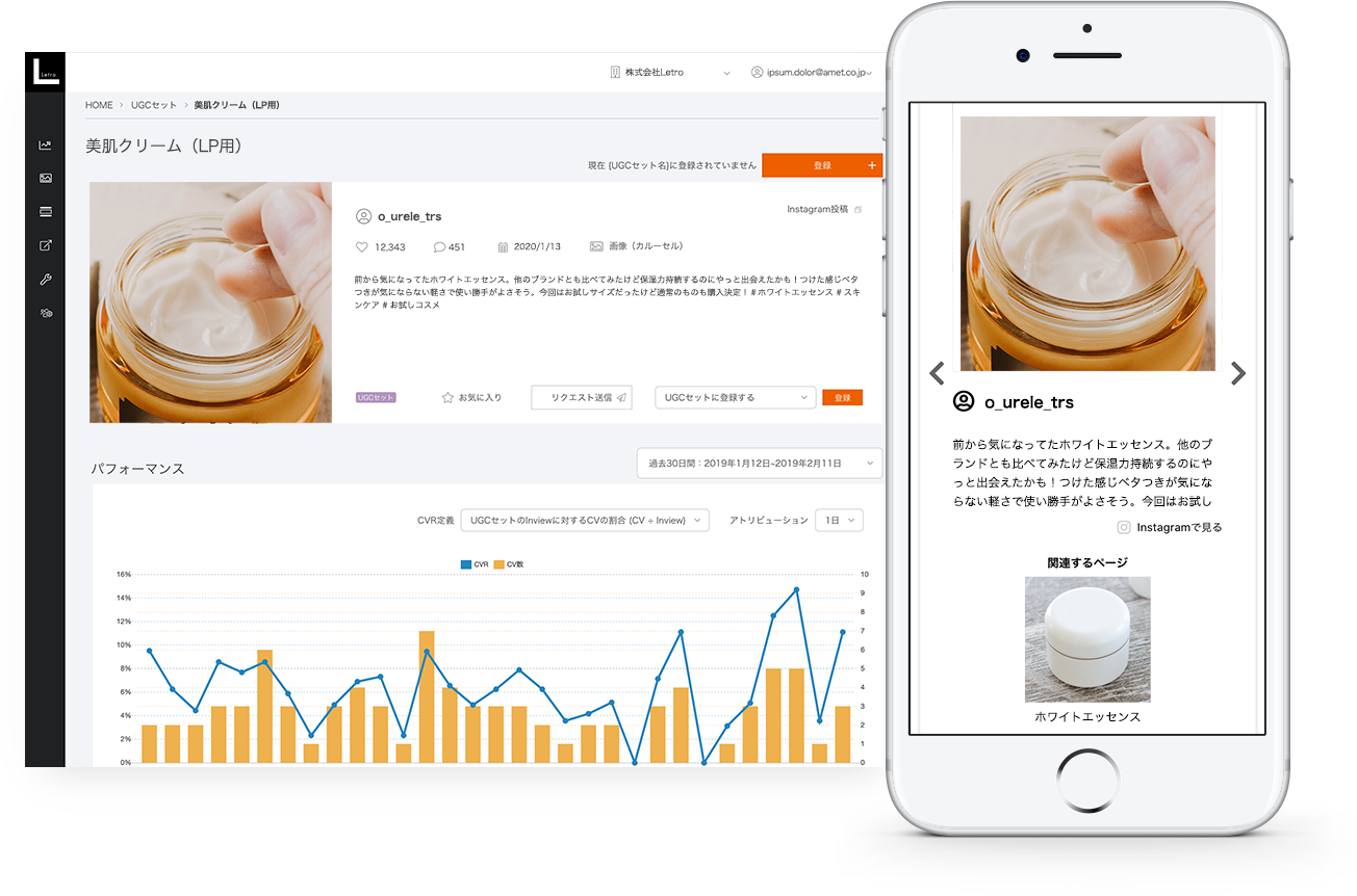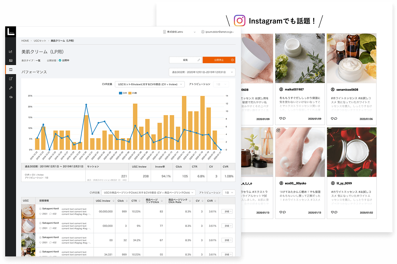 また、企業様側でお持ちの商品購入データを連携することで、購入者に対してSNS投稿を依頼することができ、商品を実際に購入し使用している方からも継続的にUGCを集めることができます。(詳細はこちら:LetroConnect)