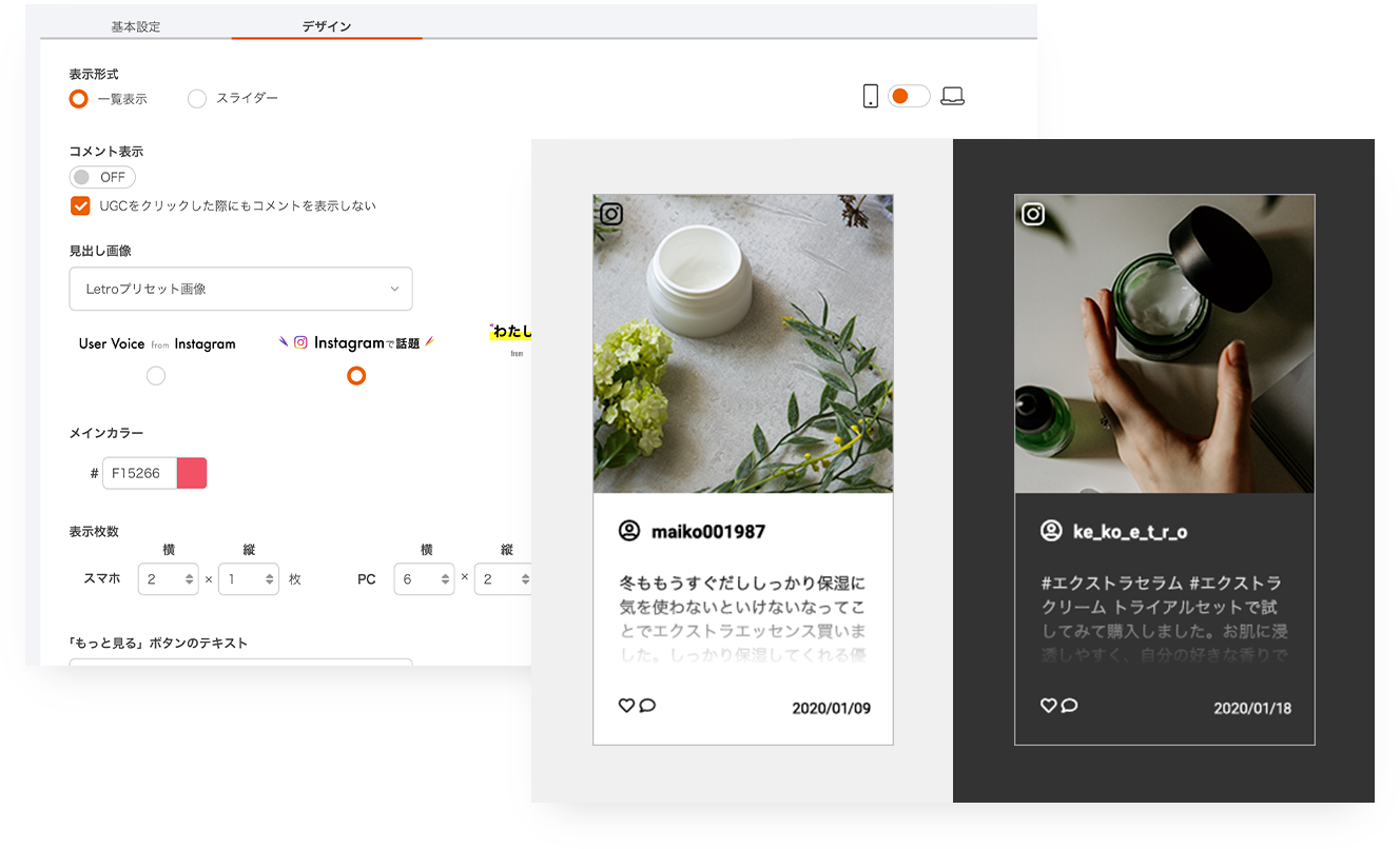 UGCの掲載先や表示させる投稿の選択はもちろん、モバイル最適化、ユーザーの投稿文の表示ON・OFF、表示時のアイコン等の色、スクロール方向の切替など詳細のデザイン設定も管理画面で調整し、ページに合わせたデザインを簡単に実現できます。